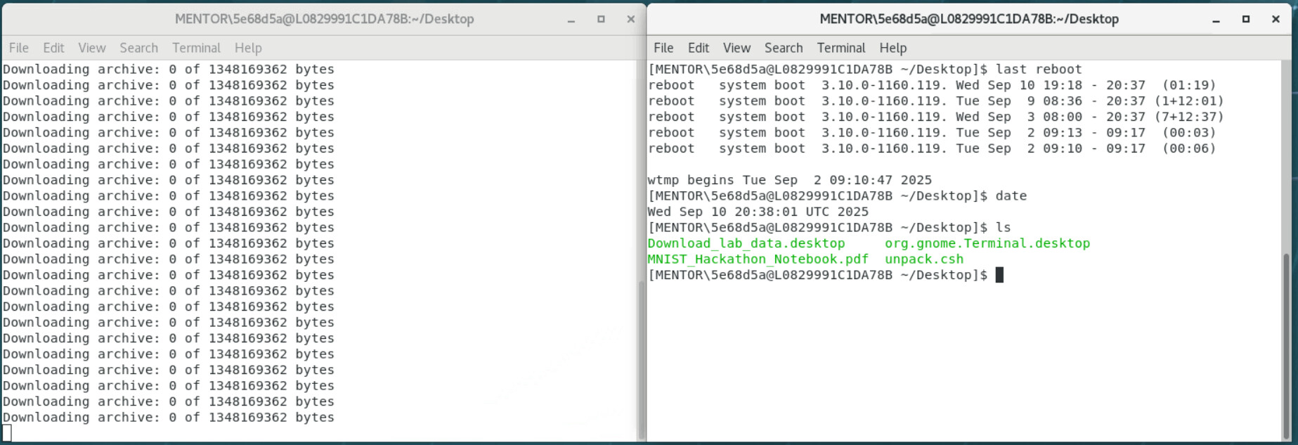 In the unpack.csh script, when file_size is smaller than expected_size, it simply prints the file size of 2025_hackathon.tgz every 10 seconds. It seems that the script is not downloading the file directly (e.g., via wget), but instead is waiting until the file system mounts or makes the 2025_hackathon.tgz file available.